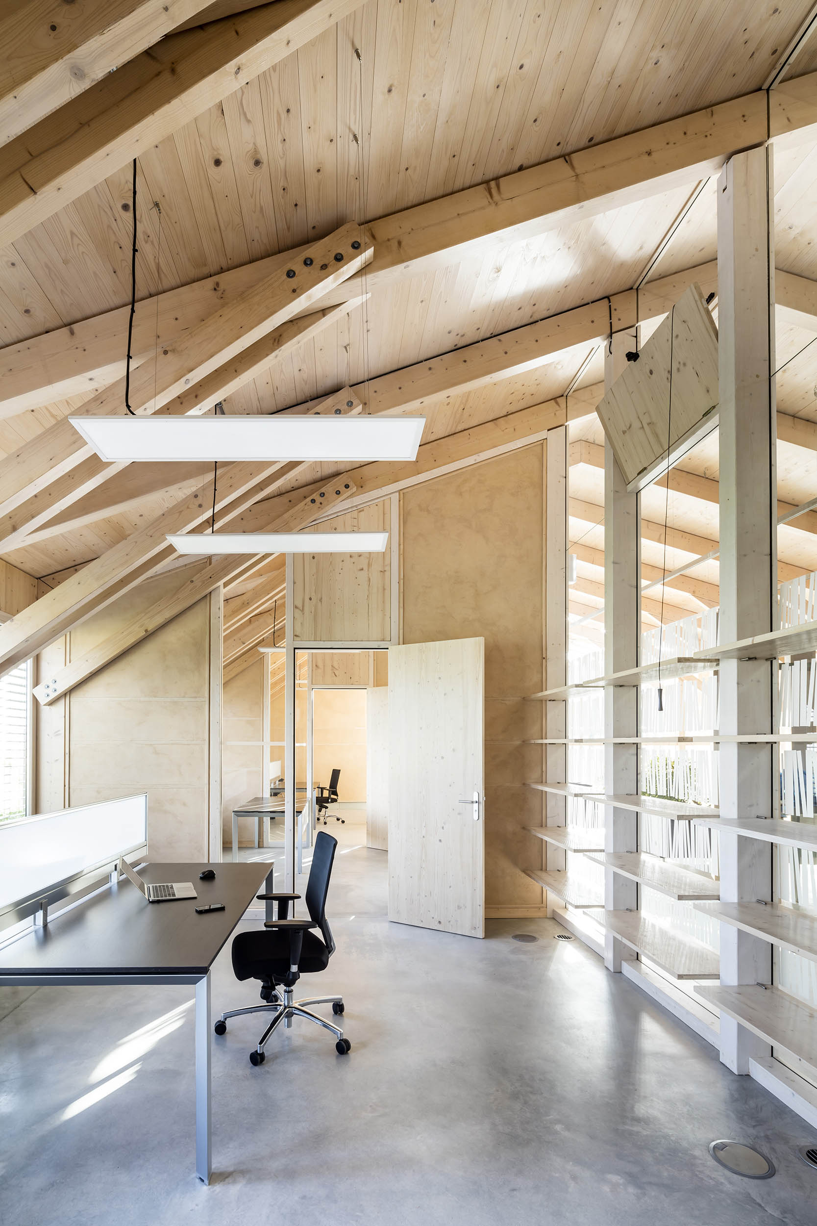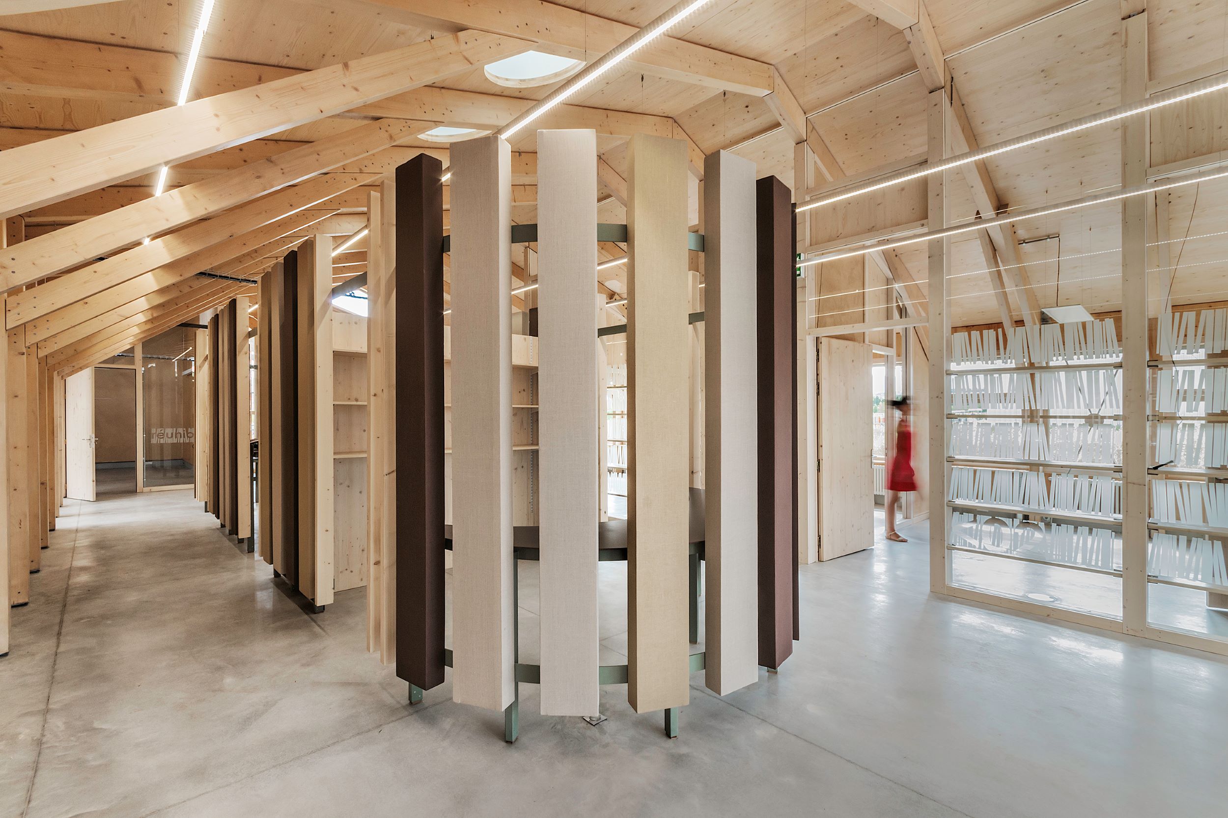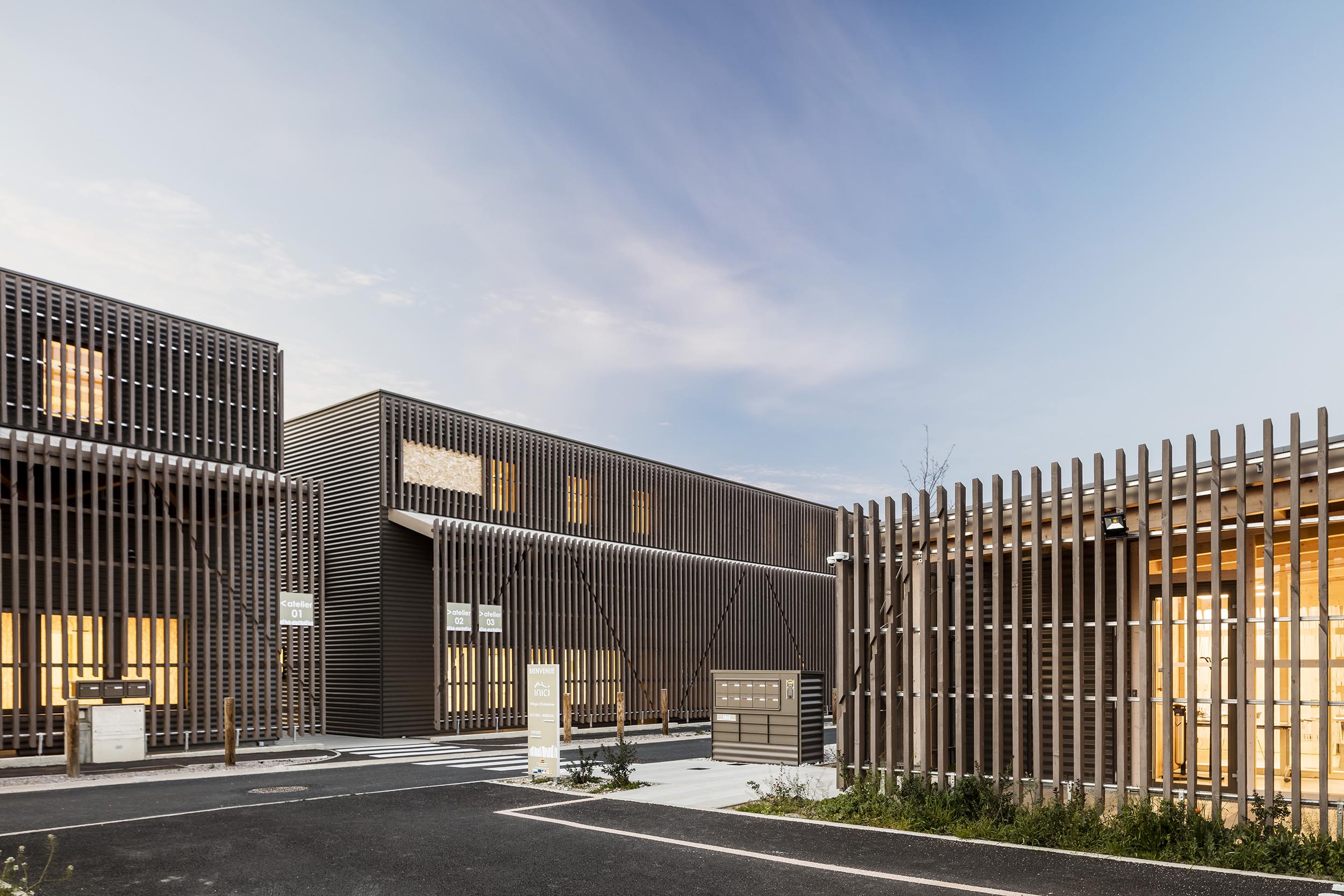 Le projet se développe de plain-pied sur deux parcelles situées de part et d’autre d’une voie publique. L’ensemble est relié au travers d’un parcours piéton qui articule le site. Les charpentes et les structures verticales en ossature bois mettent en oeuvre une essence locale, épicéa de Lozère. Les parois sont isolées en laine de bois, et les façades reçoivent des plaques d’acier laqué, doublées d’un bardage vertical ajouré en douglas. La conception bioclimatique a permis d’atteindre les exigences du label allemand Passivhaus. Une attention constante a été portée à l’impact environnemental en privilégiant les matériaux biosourcés er régionaux, et les solutions énergétiques à faible impact, comme le chauffage au bois et la rafraichissement par système adiabatique couplé à une ventilation double flux.